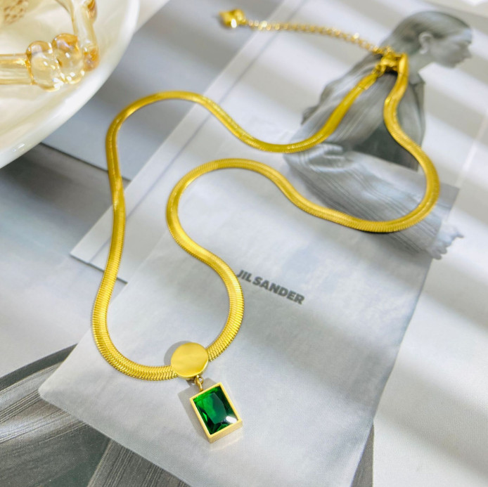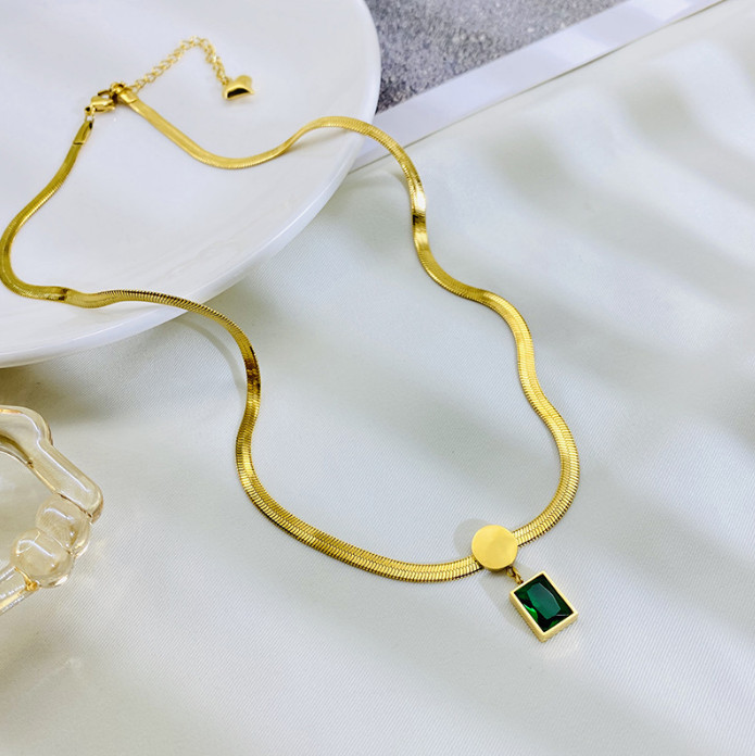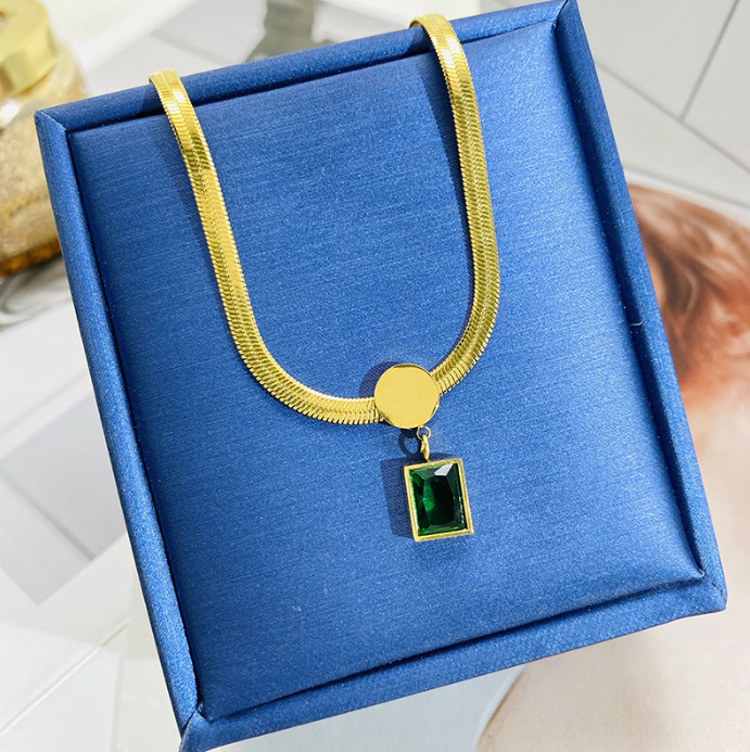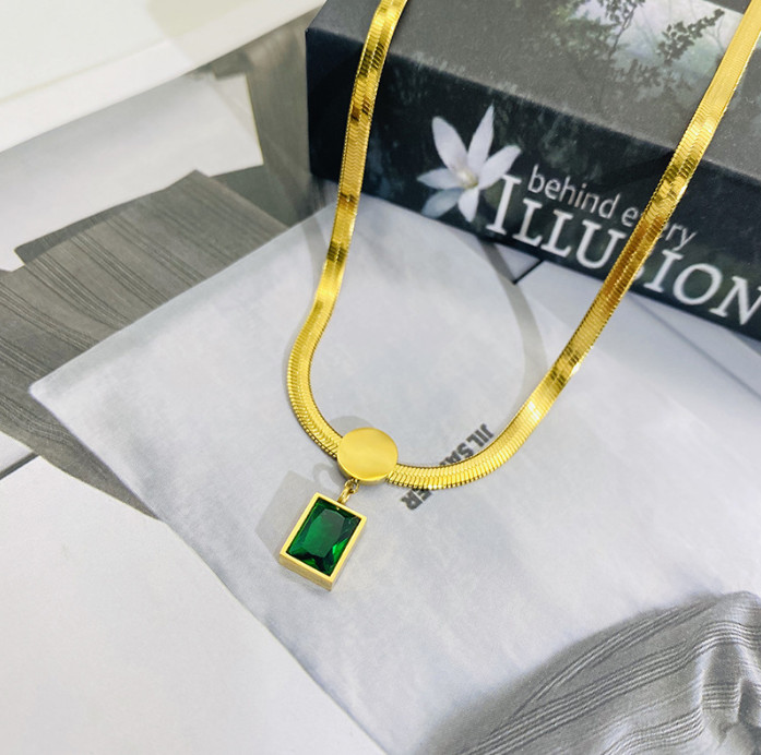 Dây Chuyền Sợi Mì Dẹt Mặt Đá Vuông Xanh Lá Titan Ko Đen TT 4369